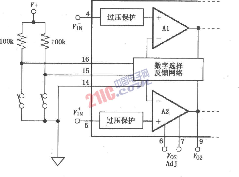 如圖所示為PGA204/205采用開關(guān)、跳線或集電極開路來選擇數(shù)字輸入的電路。圖中采用兩個開關(guān)和兩個100kΩ上拉電阻,當(dāng)開關(guān)撥到V+時為邏輯“1”。這里也可用跳線或集電極開路輸出(OC)的方式代替開關(guān),將跳線開路或OC截止來選擇邏輯“1”。當(dāng)需要固定增益時,可直接接到V+,而不必串聯(lián)上拉電阻。數(shù)字地可連接到電源V-。