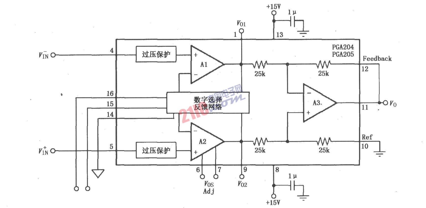 如圖所示為PGA204/205的電源和信號(hào)基本連接電路。在噪聲或高阻電源應(yīng)用時(shí),電源端要有旁路濾波電容,在設(shè)計(jì)印刷電路板時(shí)應(yīng)使濾波電容盡可能靠近電源腳。信號(hào)VIN由4、5腳輸入,經(jīng)過放大后從11腳輸出。通常Ref端(10腳)為地,輸出都是以10腳為參考,10腳接地電阻必須是低阻,以確保良好的共模抑制比。例如,當(dāng)Ref端有一個(gè)5Ω串聯(lián)接地電阻時(shí),將造成器件共模抑制比下降約80dB(G=1)。