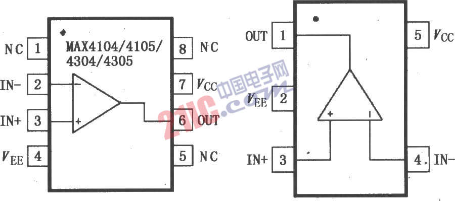 MAX4104/4105/4304/4305運(yùn)算放大器具有極高速、低噪聲和低失真性。MAX4104是單位增益穩(wěn)定補(bǔ)償,提供625MHz帶寬和400V/μs轉(zhuǎn)換速率,工作時(shí)僅需要20mA電源電流。MAX4304是增益補(bǔ)償(AvcL=2V/V或更大),提供730MHz帶寬和1000V/μs轉(zhuǎn)換速率。MAX4105是最小增益補(bǔ)償(AvcL=10V/V),提供410MHz帶寬和1400V/μs轉(zhuǎn)換速率。MAX4305是最小增益補(bǔ)償(AvcL=10V/V),提供340MHz帶寬和1400V/μs轉(zhuǎn)換速率。這些放大器具有低電壓噪聲密度和無寄生動(dòng)態(tài)范圍大等特性,是低失真/低噪聲視頻和遠(yuǎn)程通信技術(shù)應(yīng)用的理想選擇。這些運(yùn)放的輸出電壓擺幅大(±3.7V)、輸出電流能力強(qiáng)(±70mA),其引腳排列如圖所示。