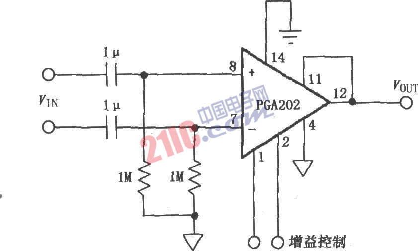 如圖所示為由PGA202構(gòu)成的交流耦合差動放大器。該電路在PGA202的輸入端加上2個1μF電容和2個1MΩ電阻,組成頻率在0.16Hz以上的高通交流耦合電路,輸入的交流信號經(jīng)過PGA202差分放大后輸出。