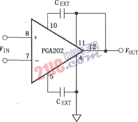 如圖所示為PGA202的輸出濾波電路。采用外接濾波電容CEXT可構成輸出濾波器,外接電容接在內部輸出放大器的求和節(jié)點,與內部電容并聯(lián)匹配,得到較低頻率的響應,使放大器噪聲得以抑制。