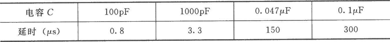如圖所示是一個(gè)負(fù)脈沖觸發(fā)的寬延時(shí)單穩(wěn)態(tài)觸發(fā)器,它提供了數(shù)秒的延時(shí)時(shí)間,用于定時(shí)精度要求不高的場(chǎng)合。圖中延時(shí)主要決定于電容C。對(duì)于TTL電路來(lái)說(shuō),R的阻值一般為5~10kΩ。下表中列出了R=5.1kΩ時(shí),延時(shí)的實(shí)測(cè)數(shù)據(jù)。C的最大容量可達(dá)幾百微法,延時(shí)可達(dá)數(shù)秒。延時(shí)結(jié)束后還需要等待一段時(shí)間(稱恢復(fù)時(shí)間),就是要等待電容C兩端電壓不再變化時(shí),方能進(jìn)行第二次觸發(fā),否則,不是電路不能觸發(fā),便是所得的延時(shí)不穩(wěn)定。等待第二次觸發(fā)所需的時(shí)間決定于RC。當(dāng)R=3.4kΩ、C=0.047μF時(shí),實(shí)測(cè)延時(shí)為180μs,恢復(fù)時(shí)間為78μs。