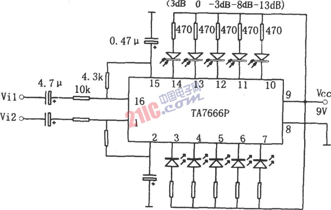 如圖所示為TA7666P雙路五位LED電平顯示驅(qū)動(dòng)電路。該電路的集成電路TA7666P為日本東芝公司的產(chǎn)品,與其同類的國(guó)內(nèi)產(chǎn)品有TB7666P、XG7666P等,可直接互換使用。
