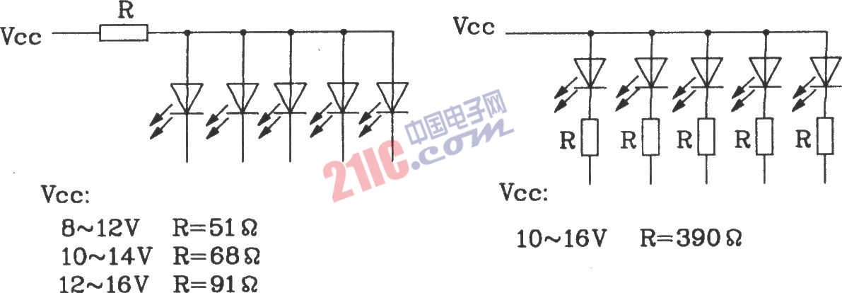 當(dāng)工作電壓高于9V時(shí),在LED電流端應(yīng)加一電阻分流,具體Vcc值不同時(shí)的電路見(jiàn)圖所示。