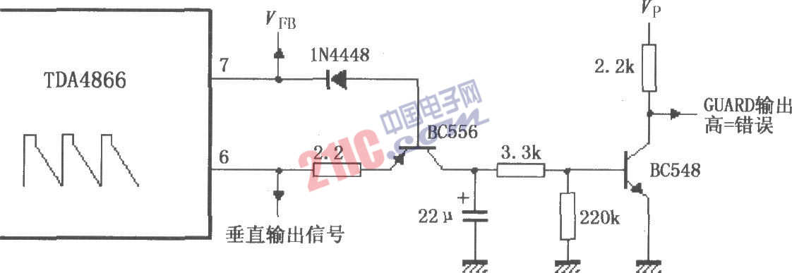 如圖所示為由TDA4866構(gòu)成的外部保護(hù)信號(hào)發(fā)生器電路。該電路的作用在于內(nèi)部防護(hù)失控時(shí),外部保護(hù)電路起作用。正常工作時(shí)垂直輸出信號(hào)的幅度較大,三極管BC556導(dǎo)通,同時(shí)三極管BC548獲得基極電流也導(dǎo)通,輸出低電平作為正常工作指示。當(dāng)工作不正常時(shí),垂直輸出信號(hào)幅度較低,三極管BC556截止,同時(shí)三極管BC548無基極電流也截止,輸出高電平作為錯(cuò)誤工作指示。
