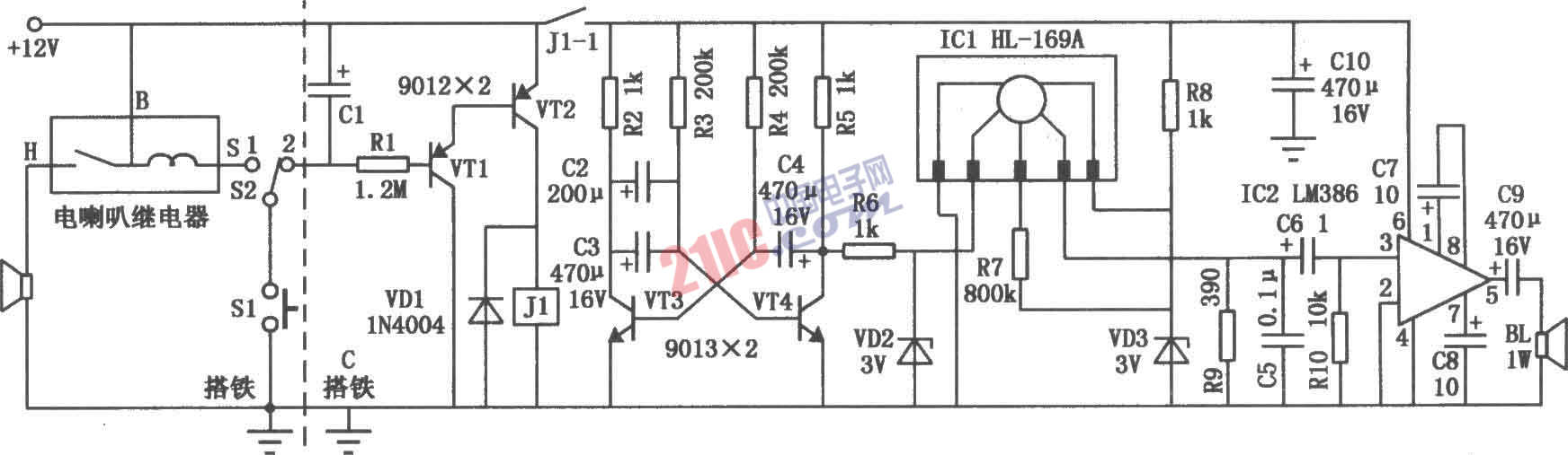 如圖所示為汽車語音喇叭的電路。圖中虛線左邊為原車電喇叭電路圖,Sl為方向盤上的電喇叭按鈕開關(guān)。S2為新增加的單刀雙擲開關(guān),用于原車電喇叭和語音喇叭之間的切換。當(dāng)開關(guān)S2置于“2”時(shí),按下開關(guān)Sl,電容Cl被充電,三極管VTl、VT2導(dǎo)通,繼電器Jl吸合,其常開接點(diǎn)J1-1閉合并保持15秒鐘向電路供電。ICl為專用語音集成電路HL-169A,由于其工作時(shí)間為2.8秒,所以用三極管VT3、VT4組成自激多諧振蕩器,每3秒鐘輸出一次高電平作為觸發(fā)信號,使ICl每3秒鐘輸出一次語音信號,送入IC2進(jìn)行音頻功率放大,由揚(yáng)聲器BL發(fā)出語音。