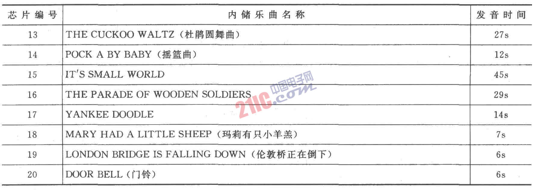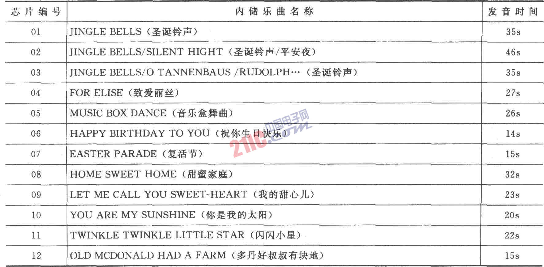 VT66/66A內(nèi)儲(chǔ)樂曲名和芯片編號(hào)關(guān)系: