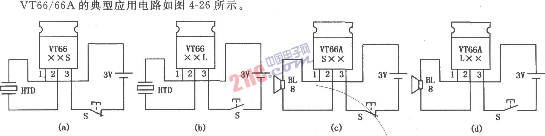 VT66/66A采用TO92形式封裝,其外形與塑封9013型晶體三極管酷似,且自身帶有一塊金屬散熱片,有3只引出腳,使用時(shí)與一般晶體三極管一樣方便,故也有人稱它為音樂三極管。如圖所示為其典型應(yīng)用電路。