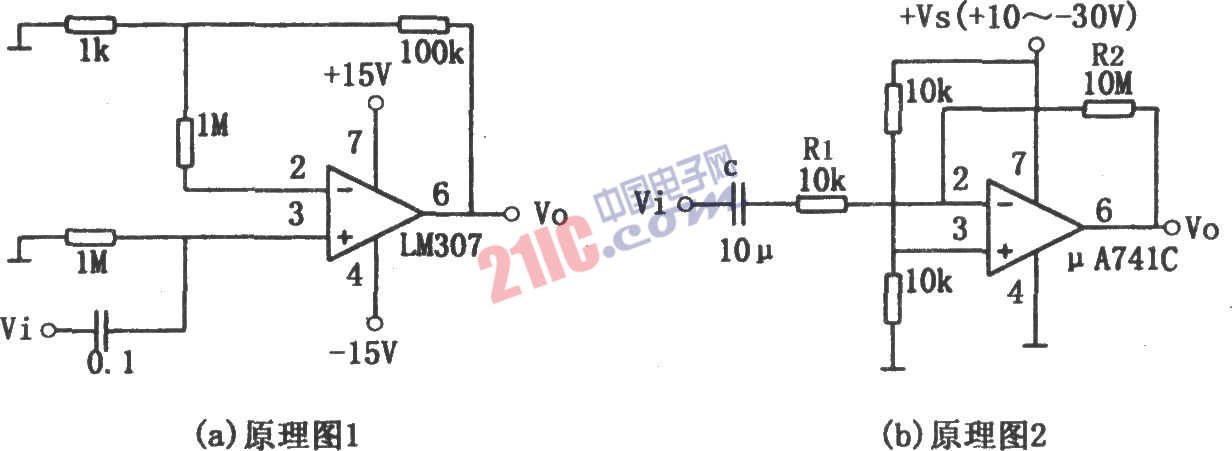 如圖所示為簡單音頻放大電路。使用集成運(yùn)放構(gòu)成的音頻放大器,其工作穩(wěn)定,易于加負(fù)反饋,所以很容易獲得均衡特性。另外,在各頻道之間串音干擾小,它也很容易進(jìn)行多頻道的輸入混合。圖(a)所示電路使用雙電源(Vs=±15V),同相、反相輸入端分別到地的靜態(tài)電阻基本平衡,其輸入信號Vi由0.1μF耦合電容送入LM307N的同相輸入端(引腳3)。對信號源而言,其輸入電阻約為1MΩ,因而其等效負(fù)載很輕。該電路的電壓放大倍數(shù)約為101倍,并且具有較好的動態(tài)特性。圖(b)所示電路采用單電源供電方式,因?yàn)榻涣鞣糯笃髦胁淮嬖谛盘柕闹绷麟娖絾栴},因而這種供電方式是可取的。該電路中,音頻信號K通過耦合電容C和電阻R1送入,μA741C的反相輸入端(引腳2)。由圖可知,電路中對直流分量引入了100%的負(fù)反饋(c對直流分量相當(dāng)開路),所以對失調(diào)電壓無放大作用。該電路的電壓放大倍數(shù)為:Av=-R2/R1=-1000(即60dB)。但應(yīng)強(qiáng)調(diào)指出的是:R1、R2和電容C具有低頻衰減和相移作用,當(dāng)信號頻率較低時,可適當(dāng)增大電容C的容量。