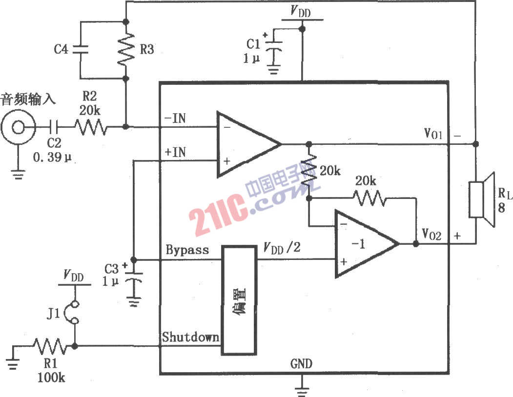 如圖所示為LM4904高增益音頻放大電路。J1為跳線,當(dāng)J1斷開時3腳接地,放大器全功率工作;當(dāng)J1接通時3腳接VDD,放大器微功率關(guān)斷。