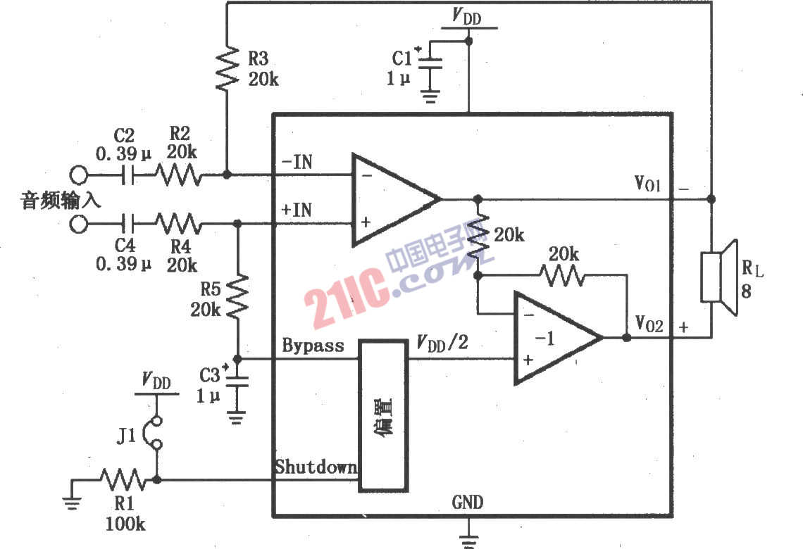 如圖所示為LM4904差分輸入音頻放大電路。音頻信號以差分的形式輸入到+IN端和-IN端。