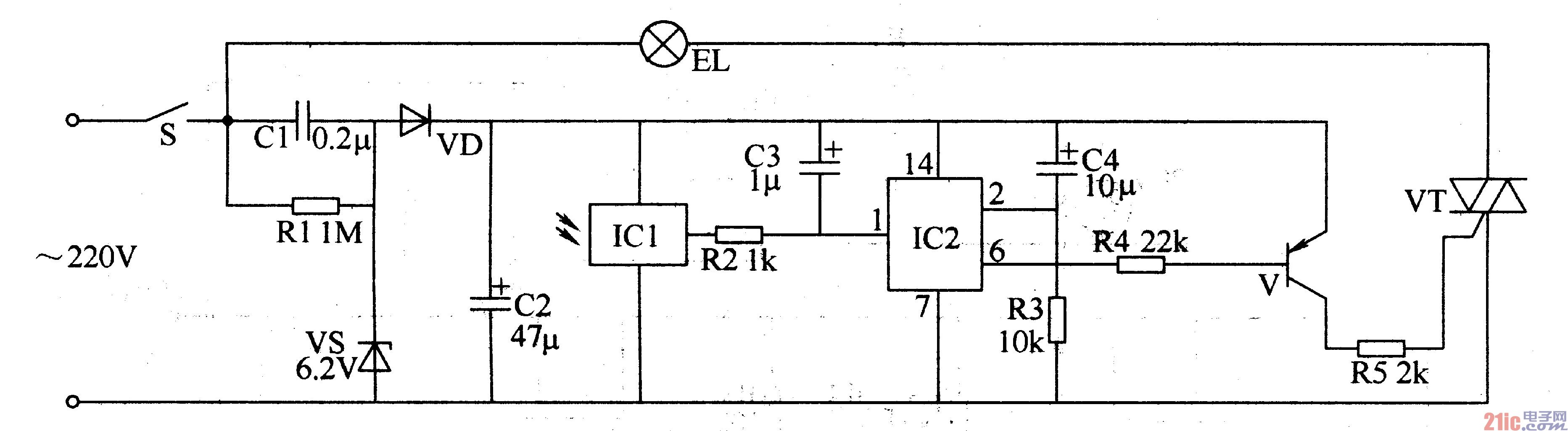 電源電路由電源開關(guān)S、降壓電容器Cl、電阻器Rl、穩(wěn)壓二極管VS、整流二極管VD和濾波電容器C2組成。