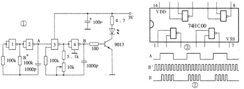 單通道紅外遙控發(fā)射電路如圖1所示。在發(fā)射電路中使用了一片高速CMOS型四重二輸入“與非”門74HC00。其中“與非”門3、4組成載波振蕩器,振蕩頻率f0調(diào)在38kHz左右;“與非”門1、2組成低頻振蕩器,振蕩頻率f1不必精確調(diào)整。f1 對f0進行調(diào)制,所以從“與非”門4輸出的波形是斷續(xù)的載波,這也是經(jīng)紅外發(fā)光二極管傳送的波形。幾個關(guān)鍵點的波形如圖2所示,圖中B′波形是A點不加調(diào)制波形而直接接高電平時B點輸出的波形。由圖2可以看出,當A點波形為高電平時,紅外發(fā)光二極管發(fā)射載波;當A點波形為低電平時,紅外發(fā)光二極管不發(fā)射載波。這一停一發(fā)的頻率就是低頻振蕩器頻率f1。 在紅外發(fā)射電路中為什么不采用價格低廉的低速CMOS四重二輸入“與非”門CD4011,而采用價格較高的74HC00呢?主要是由于電源電壓的限制。紅外發(fā)射器的外殼有多種多樣,但電源一般都設(shè)計成3V,使用兩節(jié)5號或7號電池作電源。雖然CD4011的標稱工作電壓為3~18V,但卻是對處理數(shù)字信號而言的。因為這里CMOS“與非”門是用作振蕩產(chǎn)生方波信號的,即模擬應(yīng)用,所以它的工作電壓至少要4.5V才行,否則不易起振,影響使用。而74HC系列的CMOS數(shù)字集成電路最低工作電壓為2V,所以使用3V電源便“得心應(yīng)手”了。74HC00的引腳功能如圖3所示。