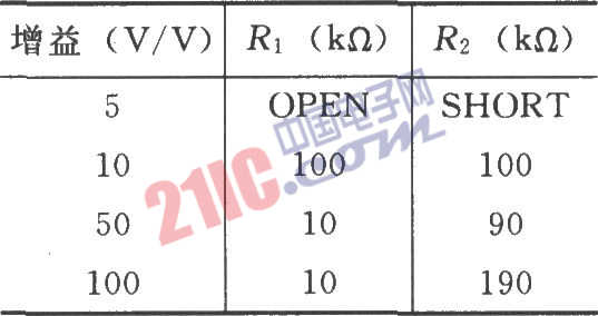 如圖所示為INA321/322的信號和電源的基本連接電路。在噪聲環(huán)境或高阻電源應(yīng)用時(shí),芯片電源端要用0.1μF電容濾波。輸出電壓是以REF端為基準(zhǔn)的,REF端必須至少低于正電源電壓1.2V。內(nèi)部增益設(shè)置為5,若需要另設(shè)增益值,可在1、5腳之間和1、6腳之間分別接R1和R2來設(shè)置增益,增益與R1、R2的選擇見下表。增益G=5+5(R2/R1)。外部增益設(shè)置電阻的選用對增益誤差和增益漂移影響很大,應(yīng)選用穩(wěn)定性好、溫度漂移小的電阻。