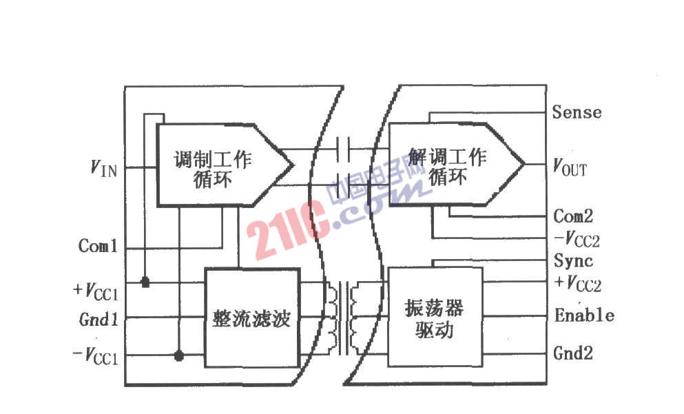 ISO107隔離放大器通過隔離柵提供信號(hào)和電源,采用陶瓷側(cè)邊引腳混合封裝,內(nèi)部包括了一個(gè)變壓器耦合DC/DC變換器和一個(gè)電容耦合信號(hào)通道。其電源是利用隔離輸入側(cè)的外部調(diào)整電路提供,一個(gè)內(nèi)部電流限制電路在當(dāng)變換器對(duì)地短路時(shí)進(jìn)行保護(hù),軟啟動(dòng)特性限制電源啟動(dòng)時(shí)的初始電流,多通道同步可以將TTL時(shí)鐘信號(hào)應(yīng)用于并行同步腳。在保持信號(hào)解調(diào)器有效狀態(tài)下,使能控制可關(guān)斷發(fā)送驅(qū)動(dòng)器,這個(gè)特性可方便地用于低功率應(yīng)用場合以減小靜態(tài)電流。寬的隔離腳距和內(nèi)部絕緣使得其對(duì)2500Vrms連續(xù)AC額定隔離等級(jí)有足夠的裕量,符合UL544測試方法的100%隔離柵破壞性試驗(yàn)確保了其可靠性。低隔離柵電容使AC漏電流最小。ISO107使用方便,可用于像PC機(jī)這樣緊湊結(jié)構(gòu)的電路板設(shè)計(jì)。ISO107的引腳排列如圖所示。