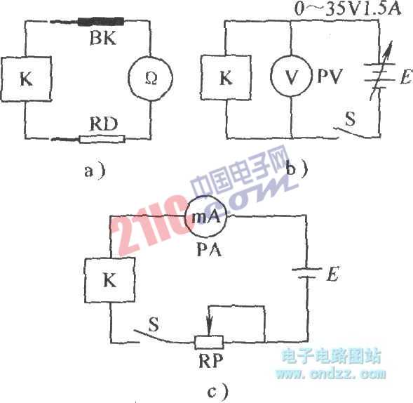 圖a為測(cè)量線(xiàn)圈的電阻.萬(wàn)用表選擇R×100Ω檔.圖b為測(cè)定繼電器吸合電壓和釋放電壓.調(diào)節(jié)穩(wěn)壓電源使之從0V逐漸上升。當(dāng)剛聽(tīng)到銜鐵“嗒”一聲吸合時(shí),此時(shí)電壓表PV指示的電壓值便是吸合電壓;然后再調(diào)動(dòng)穩(wěn)壓器調(diào)壓旋鈕,使電壓逐漸下降,當(dāng)聽(tīng)到原先吸合的銜鐵"咔"一聲釋放了,此時(shí)的電壓就是該繼電器的釋放電壓.圖c為測(cè)定繼電器的吸合電流和釋放電流.方法與圖b類(lèi)似.