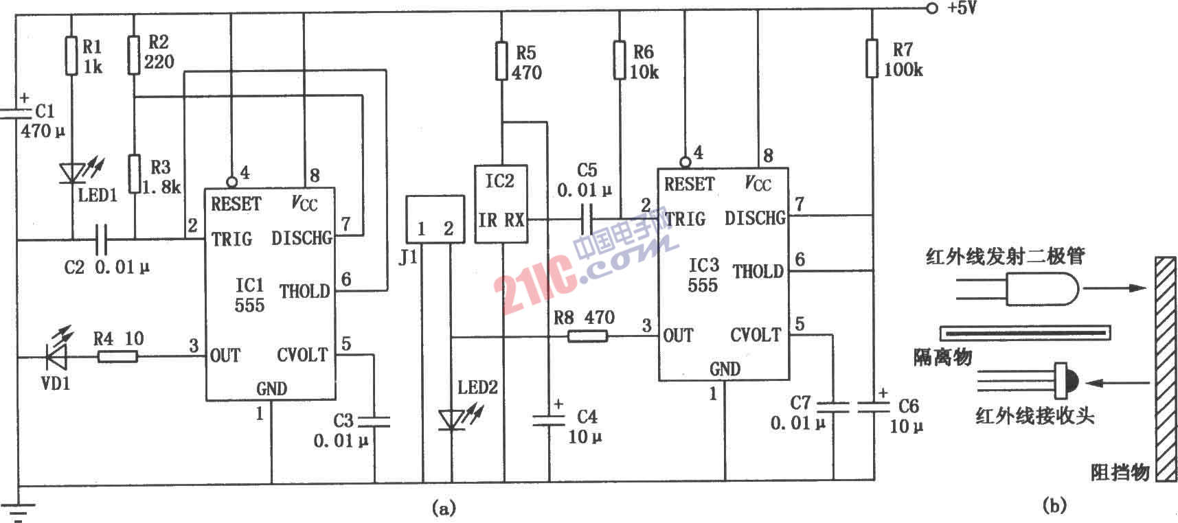近距離紅外檢測電路原理如圖(a)所示。電路通過紅外線近距離發(fā)射和接收,實(shí)現(xiàn)對被控對象的檢測。它可用于近距離自動化實(shí)時控制,如公交汽車自動門開/關(guān)控制、洗手間干手機(jī)吹風(fēng)控制等等。電路由兩部分組成:紅外線發(fā)射電路和紅外線接收電路。