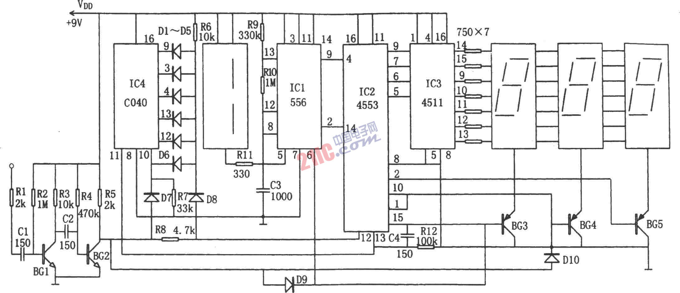 如圖所示為收音機(jī)數(shù)字式頻率顯示電路。該電路由雙時(shí)基電路556(IC1)、BCD碼3位計(jì)數(shù)器IC2(MC4553)、12位二進(jìn)制串行計(jì)數(shù)器/分頻器IC4(C040)、BCD碼七段鎖存/譯碼/驅(qū)動器、4只發(fā)光數(shù)碼管LED等組成。