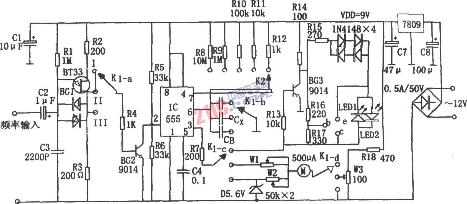 如圖所示為電容、頻率、晶體管在線檢測電路。本檢測器對(duì)電容、頻率、晶體管進(jìn)行檢測時(shí)可通過調(diào)節(jié)預(yù)置開關(guān)K1來轉(zhuǎn)換。?將K1置于II可檢測電容。555和R8~R12及待測電容Cx組成單穩(wěn)定時(shí)電路,Cx容量越大,則脈沖越寬,即td=1.1(R8~R12)Cx越長,電流平均值越大,相應(yīng)表頭的指示越大。電路中BG1為單結(jié)晶體管,其與R1、C3組成弛張振蕩器,其輸出的振蕩脈沖信號(hào)作為IC的觸發(fā)脈沖。將K1置于III可進(jìn)行頻率測量。此時(shí)單穩(wěn)電路IC輸出td'=1.1(R8~R12)CB的定值寬度的信號(hào)。輸入信號(hào)的頻率越高。IC被觸發(fā)的次數(shù)越多,則電流平均值越大,相應(yīng)表頭指示也越大。將K1置于I可進(jìn)行在線晶體管測試。該原理類似于檢測電容。電路中晶體管BG1完成正負(fù)電源的轉(zhuǎn)換。隨著IC輸出高、低電平的交替變化,若發(fā)光二極管LED1、LED2依次發(fā)光,則說明晶體管是好的,否則晶體管是壞的。
