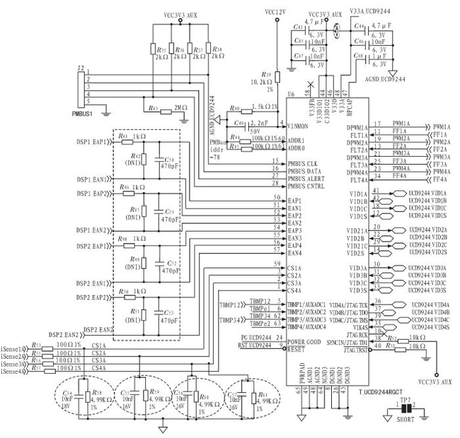 UCD9244芯片是數(shù)字PWM控制器,能同時(shí)控制4路輸出,開(kāi)關(guān)頻率達(dá)到2 MHz,采用PMBus v1.2標(biāo)準(zhǔn)。PMBus是電源管理總線,是從SMBus發(fā)展過(guò)來(lái)的,在數(shù)字通信總線上與電源轉(zhuǎn)換器進(jìn)行交流。圖2是UCD9244的控制電路圖,輸出電壓的調(diào)節(jié)主要有兩種方式,一種是通過(guò)VID接口,這種方式需要有DSP或者專用集成電路的控制,但本設(shè)計(jì)中本來(lái)就是作為DSP的電源,所以采用另一種調(diào)節(jié)方式--通過(guò)PMBus命令語(yǔ)句,對(duì)輸出電壓幅值進(jìn)行控制,這種方式也更為簡(jiǎn)單有效。為保證UCD9244整體工作,在工作電壓輸入端增加了旁路電容來(lái)減少電壓紋波,同時(shí)也對(duì)高溫、過(guò)流等異常情況增加了保護(hù)措施。