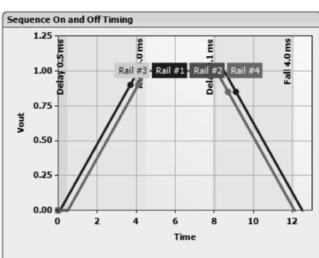 在本設(shè)計(jì)中,設(shè)計(jì)的電源為每一片DSP內(nèi)核提供的電壓為1 V,時(shí)序延遲0.3 ms.如圖6為rail 1設(shè)置的參數(shù)界面,其中,電源軌(power rail)1和2是為第1片DSP服務(wù)的,電壓幅值均為1 V,rail 2比rail 1延遲0.4 ms.剩下的rail 3和rail 4是為第2片DSP服務(wù)的,其參數(shù)設(shè)置于第一片DSP完全相同,所以圖中只顯示了兩個(gè)rail,另外兩個(gè)與之重合。值得一提的是,UCD9244芯片的時(shí)序設(shè)置還可通過(guò)電壓跟蹤來(lái)實(shí)現(xiàn),即后上電的電源軌可以跟蹤先上電的電源軌,這樣就自然滿足了時(shí)序的設(shè)置。在這里采用前一種方法的原因主要是在后續(xù)調(diào)試的時(shí)候可以通過(guò)示波器方便地觀察出波形的延遲是否和筆者的設(shè)計(jì)吻合。