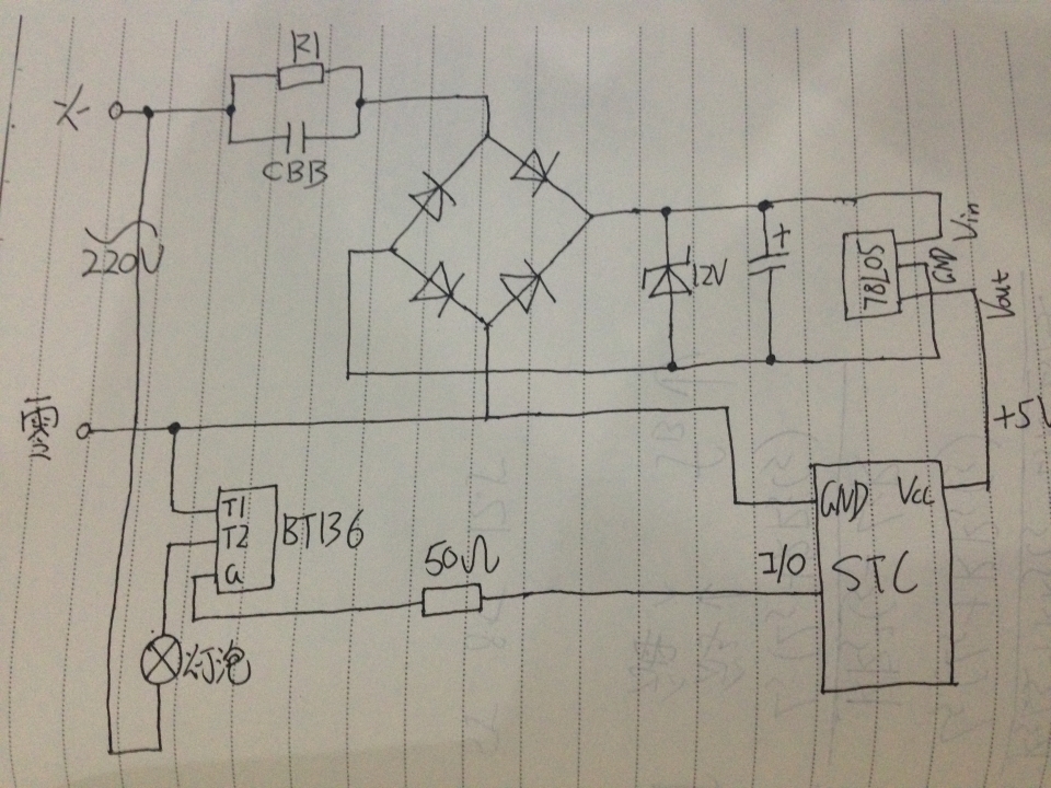 如附件所示,220V的市電經(jīng)過(guò)一個(gè)60W的燈泡加載可控硅BT136的T1和T2端,可控硅控制極G經(jīng)過(guò)一個(gè)50歐姆2W的電阻接到單片機(jī)的一個(gè)I/O口上。