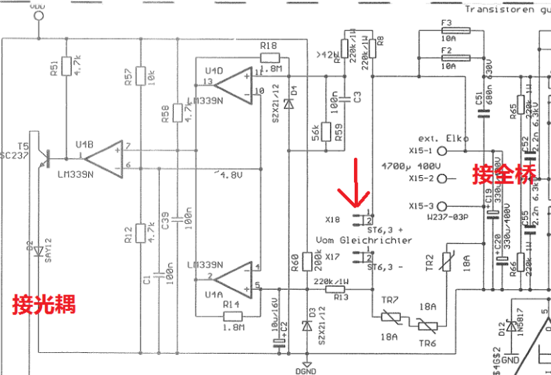 德語圖紙,市電220V進(jìn)來接整流濾波,接大電容然后接到x15, 右邊是全橋逆變,左邊三極管和左上VDD接成一個(gè)光耦開關(guān),光耦開關(guān)后面接了個(gè)單穩(wěn)態(tài)觸發(fā),接到ucc3895的CS端(過流和限流保護(hù)端,2~2.5V正常工作)。