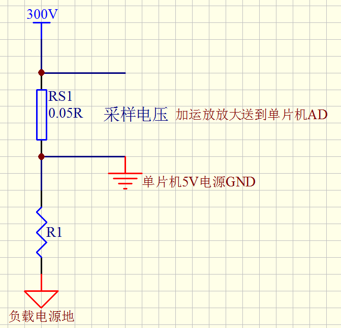 由于1個(gè)負(fù)載有多個(gè)支路,只能采集負(fù)載供電上端的電流,現(xiàn)在 看到的方案都是低端采集的,就是一個(gè)檢流電阻接地,一端接負(fù)載的負(fù)極,通過電阻的壓降,計(jì)算電流,這種方式不適合我,我自己畫個(gè)簡(jiǎn)圖不知道是否可行,畢竟電壓很高,會(huì)影響低電壓電路,單片機(jī)我打算單獨(dú)供電,和負(fù)載的電源地分開來(隔離供電。
