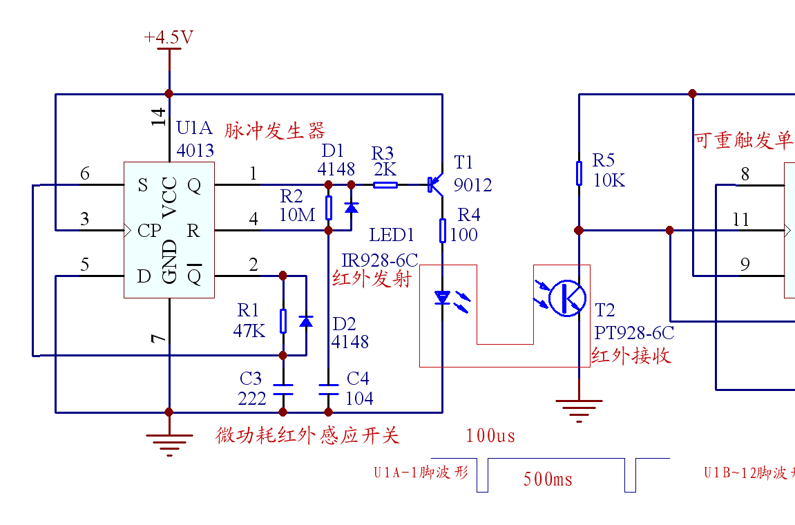 想設(shè)計一指示燈電路。要非常節(jié)能。電源電壓是12V的。初步設(shè)想是讓一發(fā)光管1s亮一次。一次亮1ms。想控制LED不亮的時候電路小于50uA.led點亮時候電流在5mA.控制電路是個問題。用單片機吧。單片機本身和降壓電路的功耗就不止100uA了.有沒有這樣的低功耗芯片?對電容充電。充好的電量瞬間通過LED放電。我用coms的555芯片做的電路。其充電電流和工作電流加起來在170uA去了。
