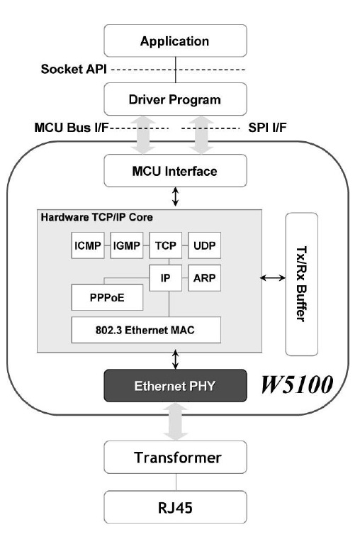 W5100 內(nèi)部 集成了全硬件的TCP/IP 協(xié)議簇(TCP, UDP, ICMP, IGMP, IPv4, ARP, PPPoE, Ethernet)、4個(gè)獨(dú)立的Socket接口、一個(gè)MAC和PHY、支持MDI/MDIX,本議題就是基于該芯片所開發(fā)的應(yīng)用,在沒(méi)有操作系統(tǒng)的情況下只需要做socket編程即可,也不用理睬網(wǎng)絡(luò)協(xié)議 。