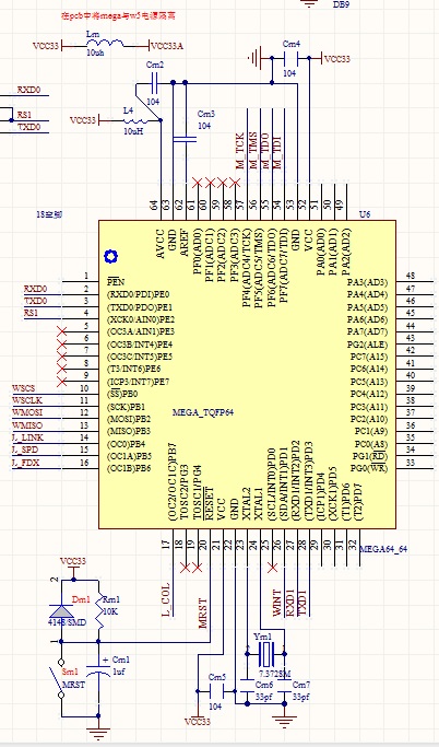 其次,是主控單片機(jī),選用Mega128L,3.3v低電壓,內(nèi)部存儲(chǔ)器極其巨大,單片機(jī)中的航空母艦。