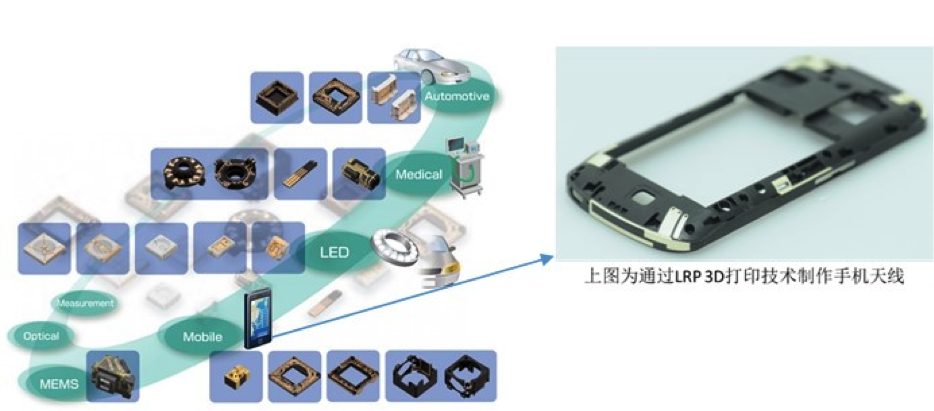 LRP指通過三維印刷工藝,將導(dǎo)電銀漿高速精準(zhǔn)地涂敷到工件表面,形成天線形狀,然后通過三維控制激光修整,以形成高精度的電路互聯(lián)結(jié)構(gòu)。