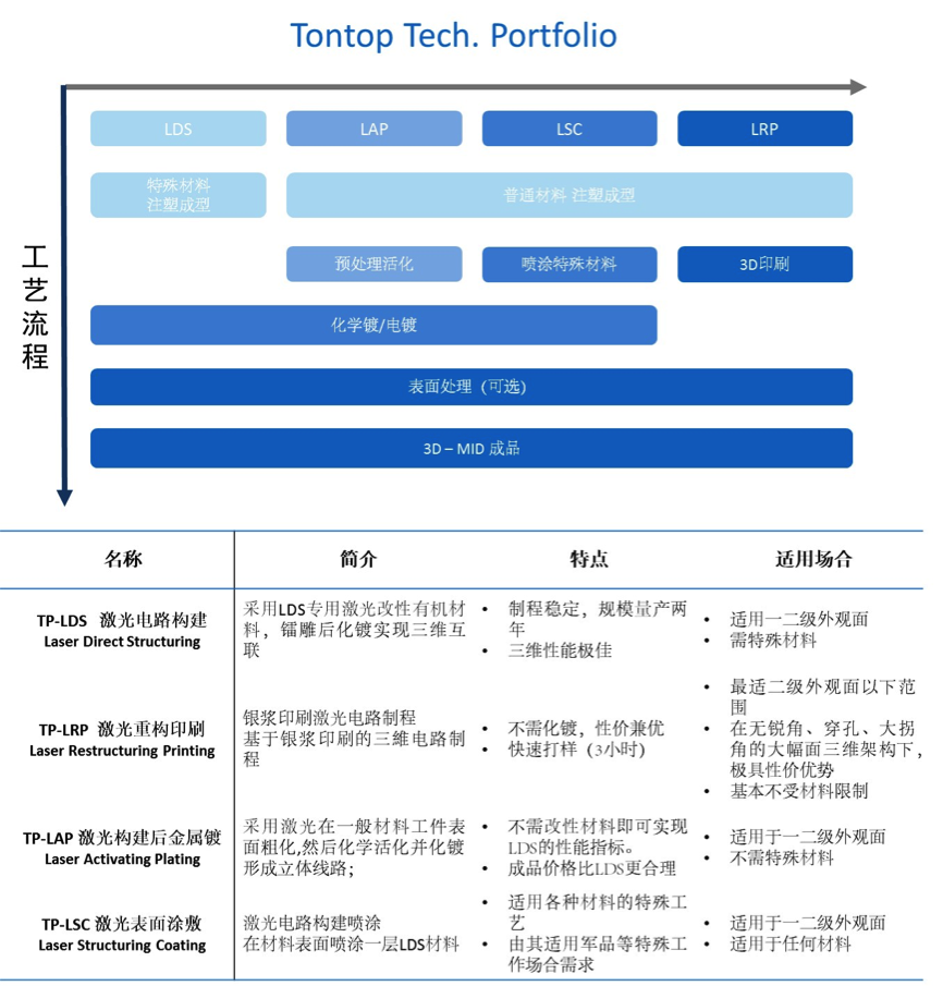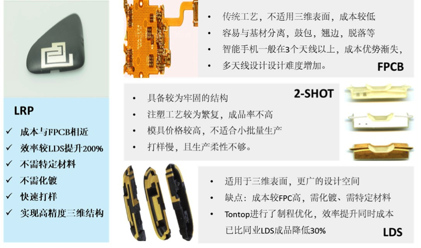 與現(xiàn)在流行的3D打印概念不一樣,3D-MID技術(shù)的LRP(激光重構(gòu)印刷)是適用于大規(guī)模量產(chǎn)的基于3D激光的3D打印技術(shù),與傳統(tǒng)的量產(chǎn)工藝對比,具備明顯優(yōu)勢: