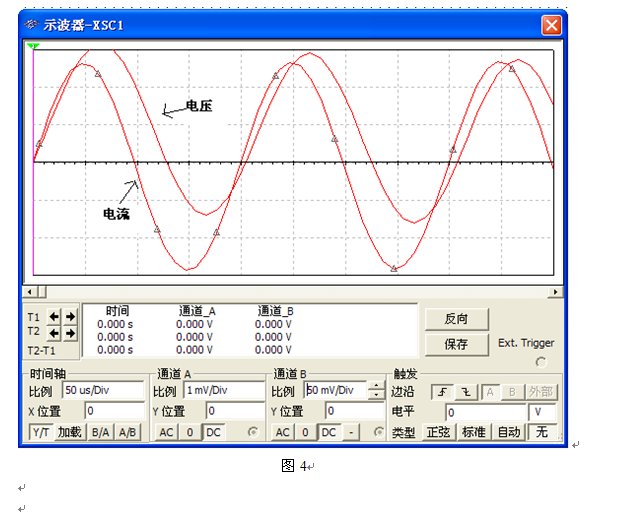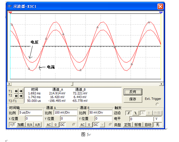 第二步,把電源電壓頻率提升到5kHz,觀察示波器波形如圖4所示,從圖中可以發(fā)現(xiàn)電壓的相位仍然滯后于電流,但是差距明顯變小了。這說明電路的性質(zhì)正在向純阻性轉(zhuǎn)變!