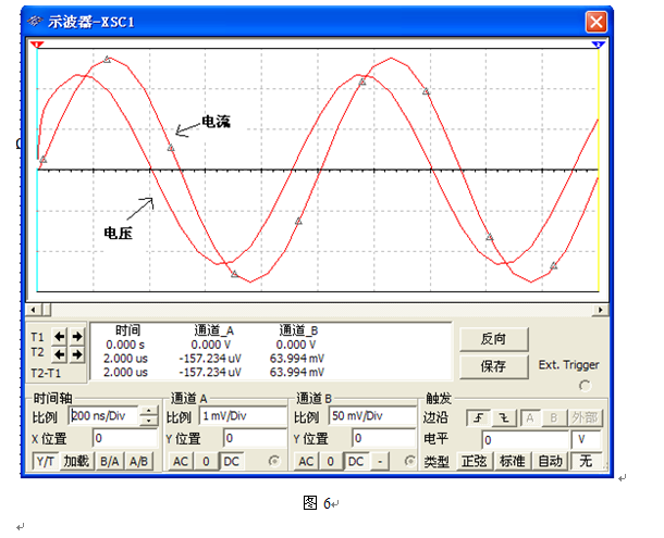 第四步,繼續(xù)增加電源頻率到1MHz,觀察示波器波形,如圖6所示??梢钥闯鲭妷旱南辔灰呀?jīng)超前電流的相位了,差距在0——π/2之間,說明電路已經(jīng)呈現(xiàn)出了一定的感性,但是還沒達(dá)到純感性電路的水平。