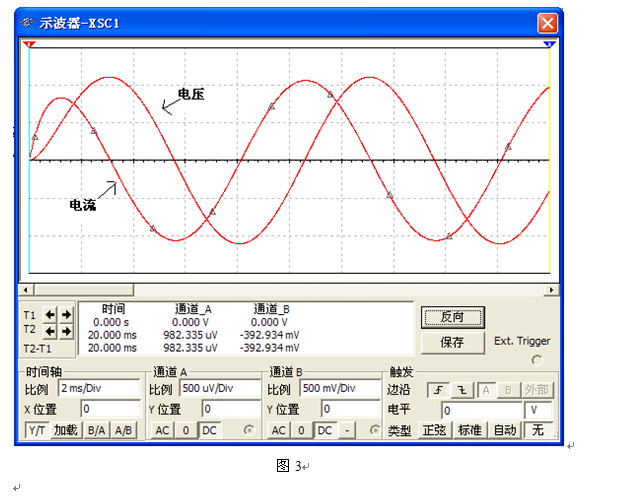 在圖2中,要想知道A、B間的電路呈現(xiàn)什么性質(zhì),只要測(cè)量出其中的電壓電流關(guān)系。電壓可以由示波器直接測(cè)量,為了能在示波器上直接觀察A、B間的電流大小,我在電路中串聯(lián)個(gè)小阻值電阻R3,它可以將電流信號(hào)轉(zhuǎn)換為電壓信號(hào),它兩端的電壓大小是和電路中的電流成線性比例關(guān)系的,測(cè)量它兩端的電壓波形就能知道電路中電流的波形。