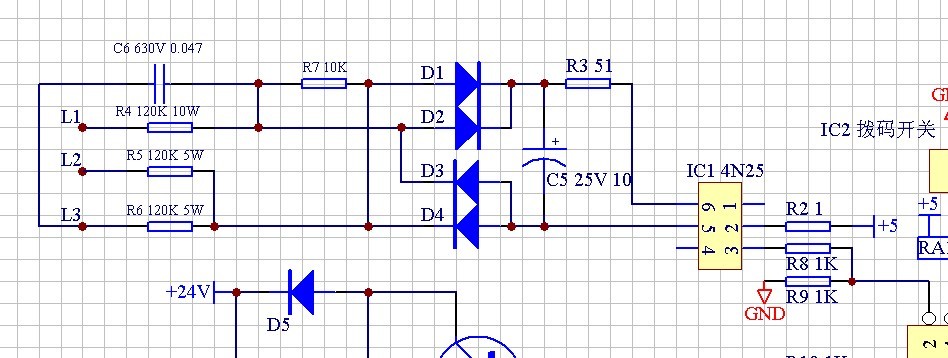 小弟費(fèi)解了很久的電路。 L1 L2 L3是三相電源輸入端, 系統(tǒng)供電是由L1 L2通過(guò)變壓器整流得到。 4N25 是個(gè)光耦(原理圖估計(jì)是抄板的來(lái)的) 。 光耦輸出的信號(hào)由單片機(jī)檢測(cè)。 產(chǎn)品是個(gè)三相電機(jī)控制系統(tǒng)。