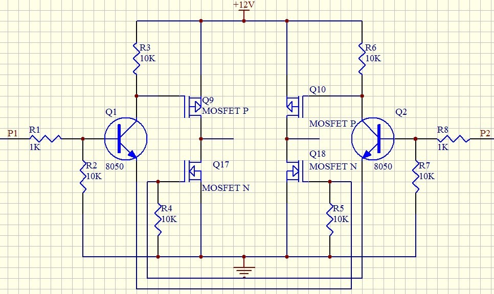 樓主試下Q1控制左邊兩個MOS,Q2控制右邊兩個MOS