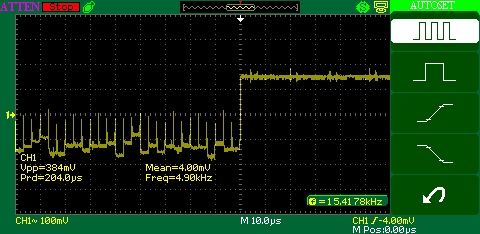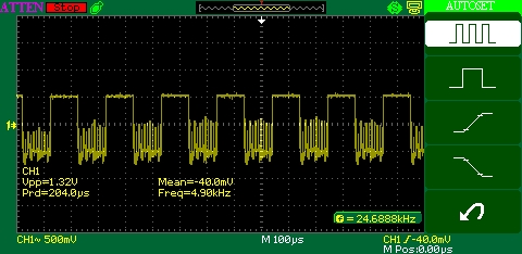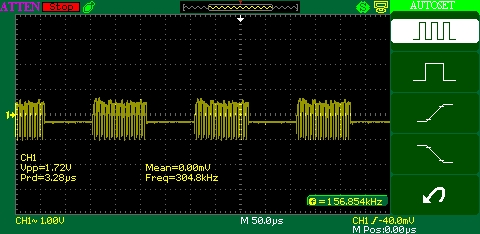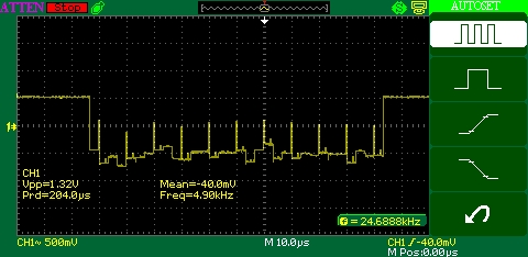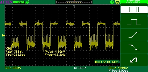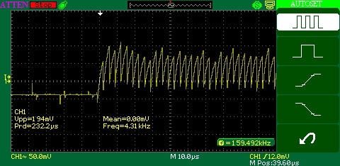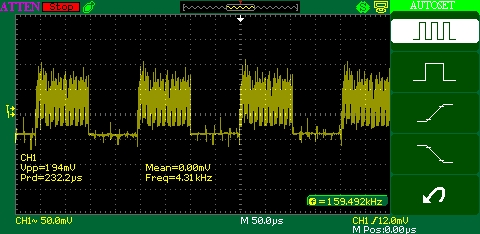輸入是158mV的模擬采集信號(hào)其實(shí)是0064芯片處理后32通道信息的差分信號(hào),差分信號(hào)分P/N ,這是其中的1路P;實(shí)際波形是接近方波但有很多類似毛刺的波形,頻率4.9KHZ.