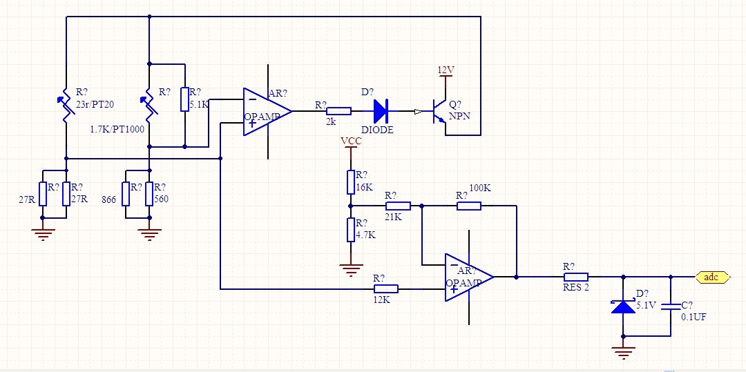 在和金工交流了一下以后,他說了一個(gè)很有創(chuàng)新的想法,如果我用一個(gè)氣壓瓶。就是那種液化氣罐的意思,這種東西放氣(在買一個(gè)風(fēng)速儀當(dāng)標(biāo)準(zhǔn)表用),大家說能不能達(dá)到30m/s呢?也算是模擬空氣流動(dòng)了么,呵呵。最近在做這個(gè)熱膜式風(fēng)速探測(cè)儀,原理圖什么出來了(抄板:lol )結(jié)果不知道接下來該怎么做了,按我看到的文獻(xiàn)上面寫這種風(fēng)速探測(cè)儀是非線性的,這下我就郁悶了,由于手上沒有設(shè)備,不知道怎么辦才好了,哪位做過的大俠給俺指點(diǎn)下迷津。不勝感激。下面是我抄的原理圖的探頭部分。探頭分別是PT20,和PT1000
