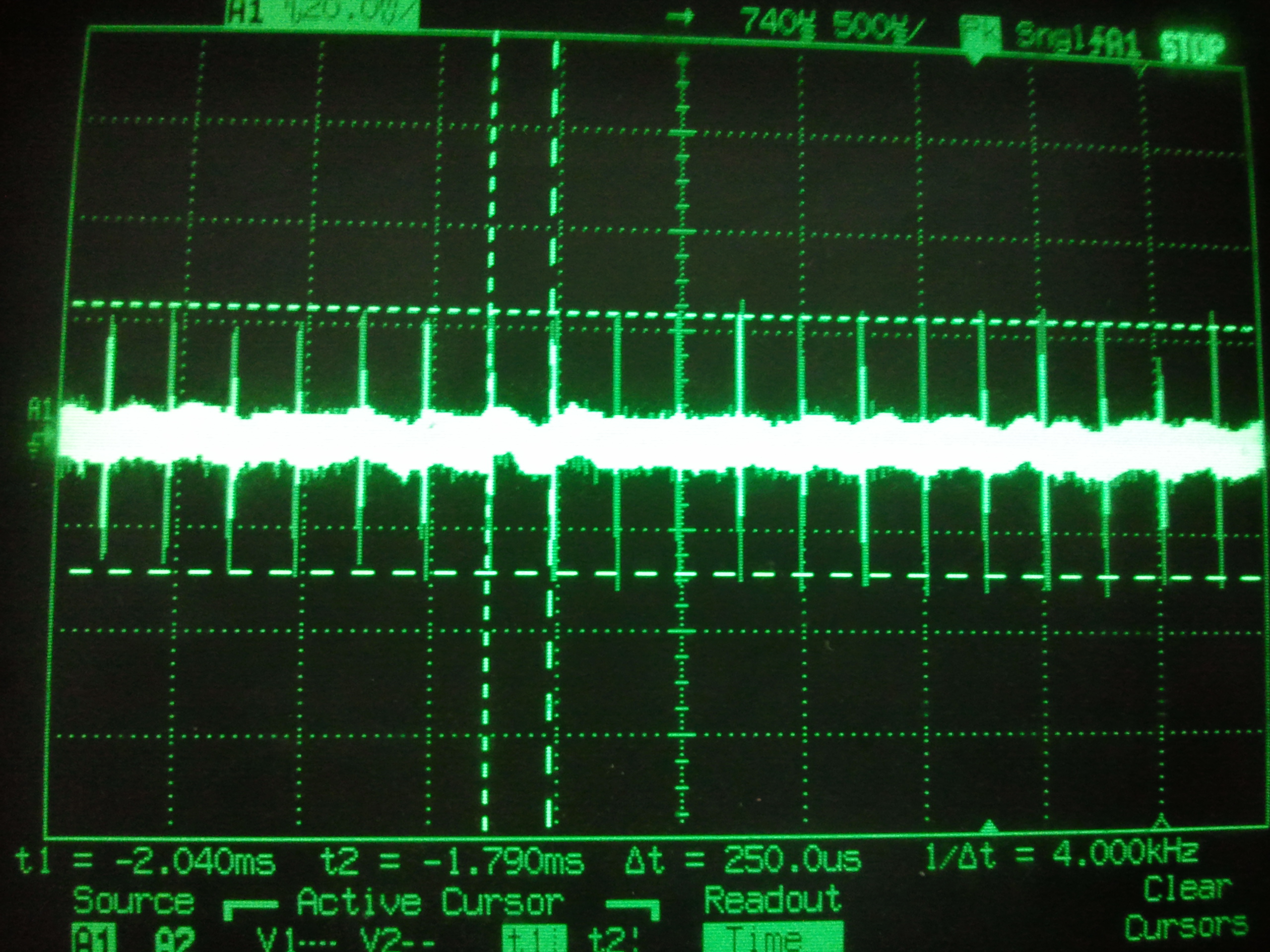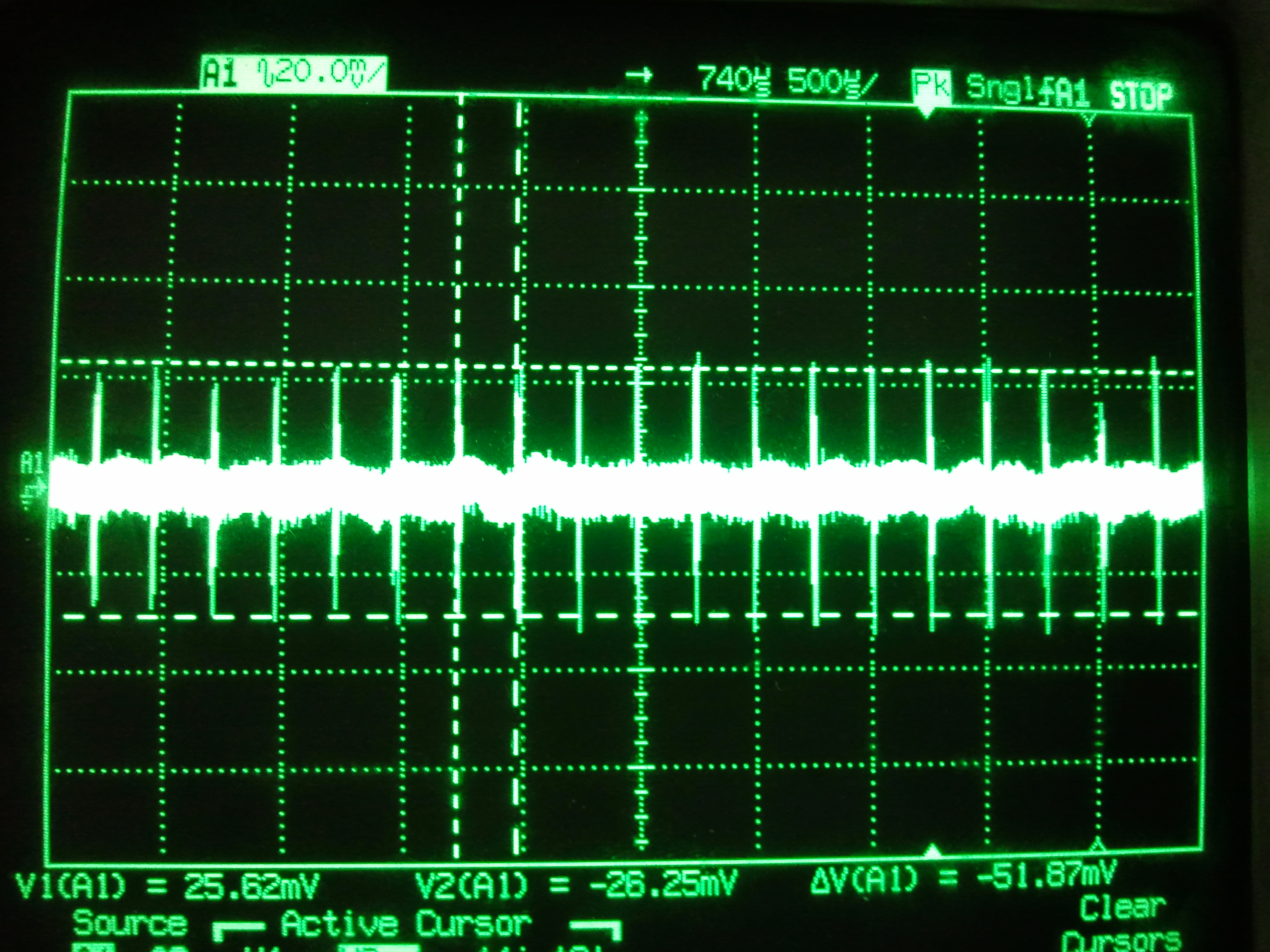 下面的是示波器交流耦合后的電源的圖,波動的周期是4K,跟采樣頻率溫和,幅值51mv