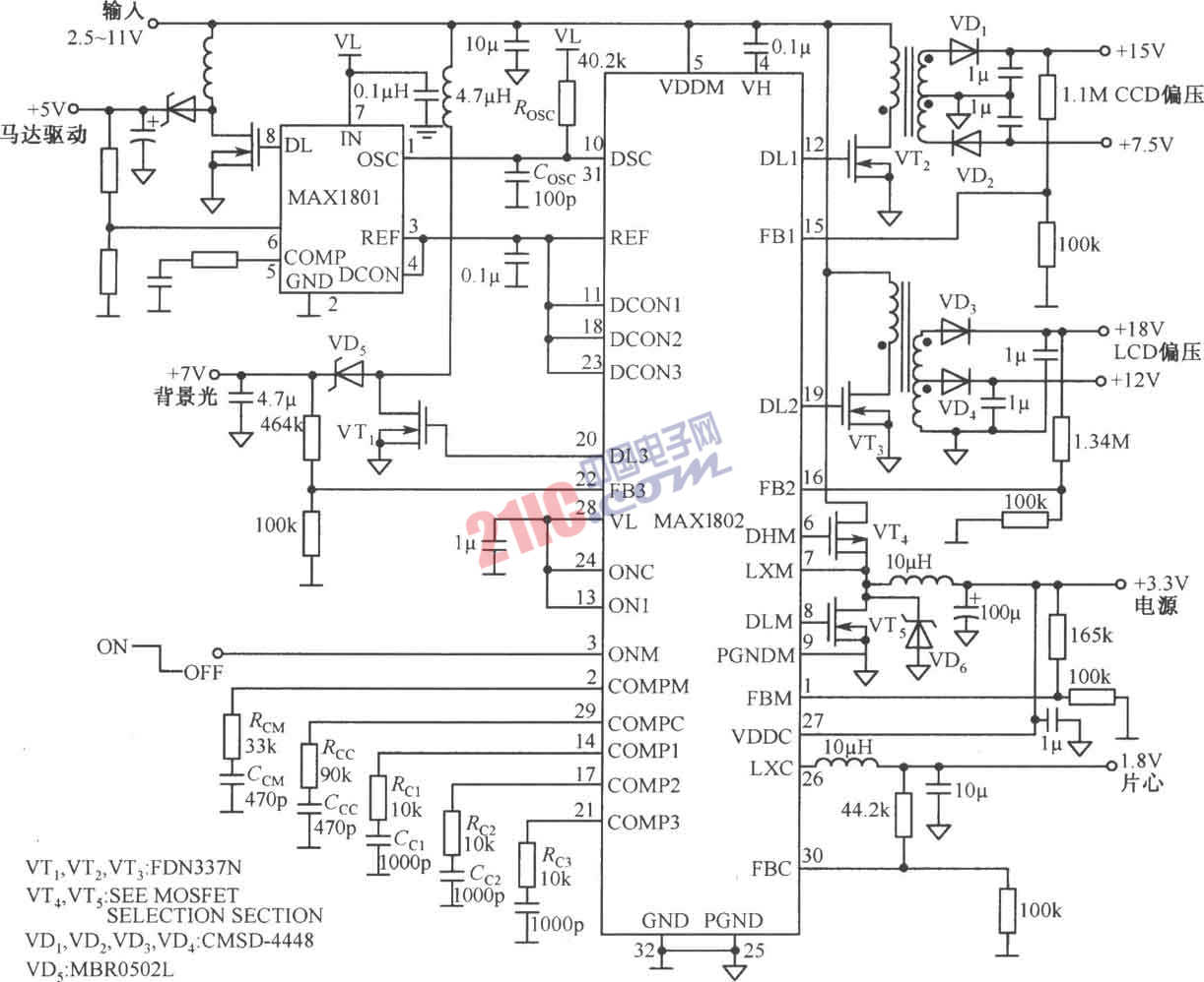 由MAX1802構(gòu)成的多路輸出數(shù)碼相機(jī)電源電路如圖所示。MAX1802芯片有兩個(gè)降壓變換器和三個(gè)升壓變換器,輸入電壓范圍為2.5~11V,輸出電壓為2.7~5.5V連續(xù)可調(diào),最低輸出電壓可以調(diào)節(jié)到1.25V。MAX1802的工作頻率可達(dá)1MHz,變換效率可達(dá)94%。