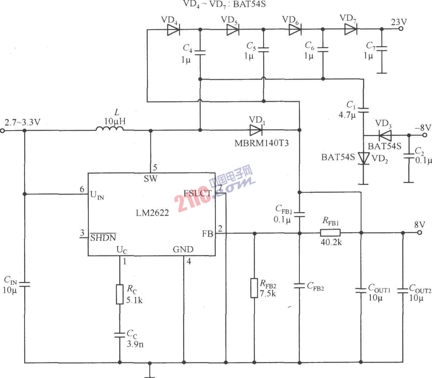 由LM2622構(gòu)成的三輸出電壓為23V、8V、-8V的電源電路如圖所示。LM2622是一個600kHz升壓PWM DC/DC變換器,它可將3.3V輸入電壓轉(zhuǎn)換為8V、-8V和23V三輸出電壓,輸出電流可達(dá)l.6A??梢允褂脼V波器和低噪聲元件,工作電壓可以低至2.0V。