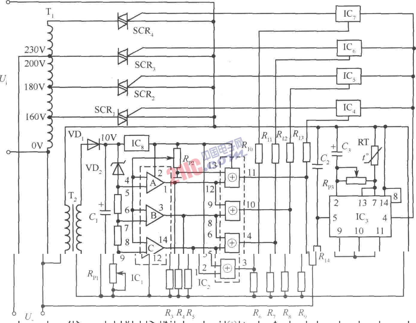 圖中,T1:自耦變壓器;Y2:取樣變壓器;ICl:LM339;IC2:CD4070;IC3:TWH9205; IC4~I(xiàn)C7:TWH8778;IC8:W7806;電阻Rl、R2:150Ω;R3~R9:10kΩ;Rl0~Rl3:20kΩ;R14:20kΩ、4W;熱敏電阻RT:47kΩ;RPl:680Ω;Rp2:4.7kΩ;Rp3:100kΩ;Cl:47μFl6V;C2:0.1μF;C3:100μF16V;VD1:lN4002;VD2:2CW54;可控硅SCRl~SCR4可據(jù)負(fù)載功率的大小來(lái)合理選擇。