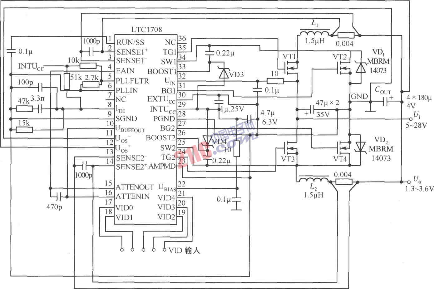 振蕩頻率=310kHz;VTl~VT4:FAIRCHILD FDS7760A;Ll~L2:SUMIDA CEP125-1R5M;COUT:PANAS()NIC EEFUEOG181R;VD3,VD4:CMDSH-3TR