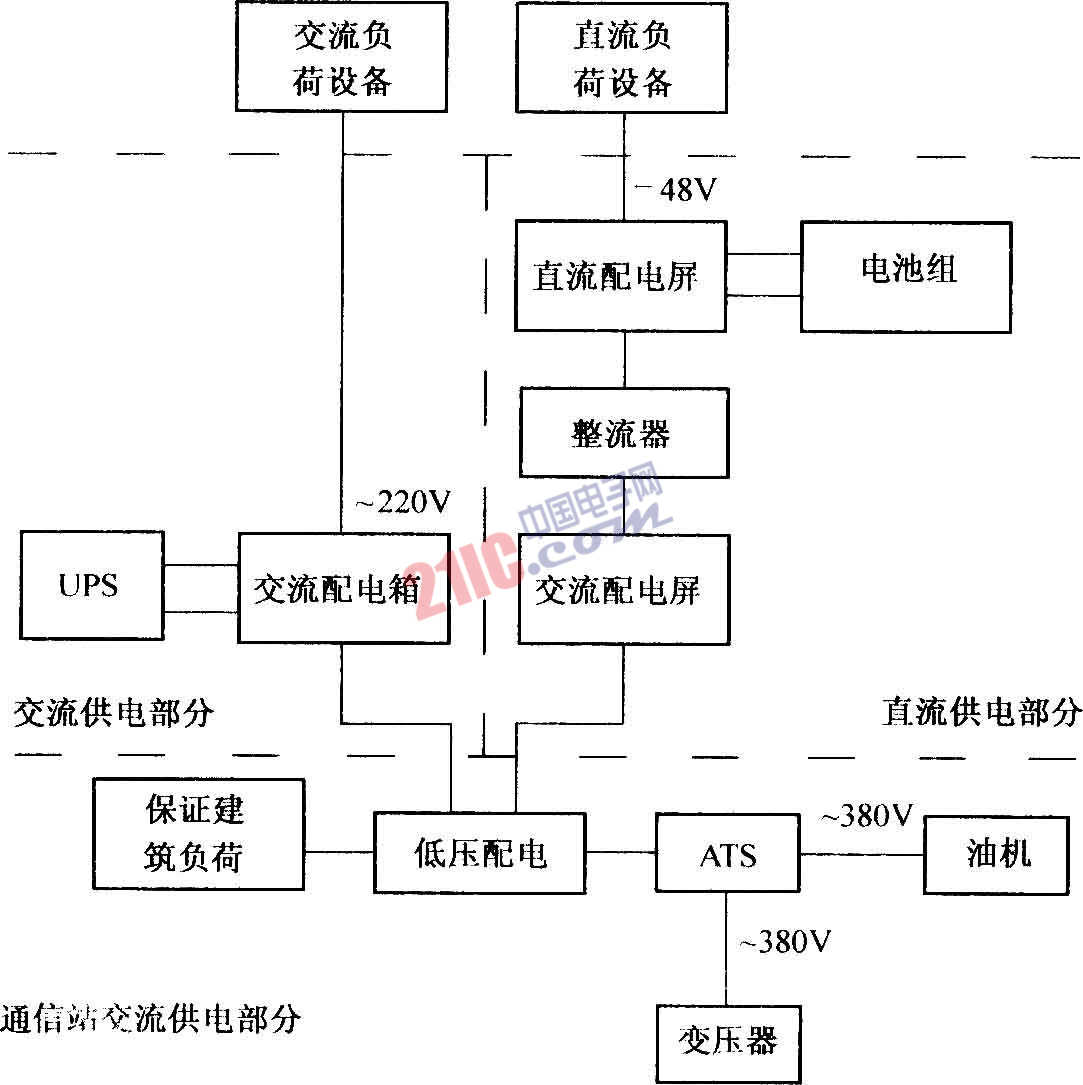 通信電源專(zhuān)指對(duì)通信設(shè)備直接提供的電源.通信電源是通信站電源的主體和關(guān)鍵部分,通信站電源還包括允許短時(shí)間中斷的保證建筑負(fù)荷,如機(jī)房空調(diào)等.一般通信站電源組成如圖所示.