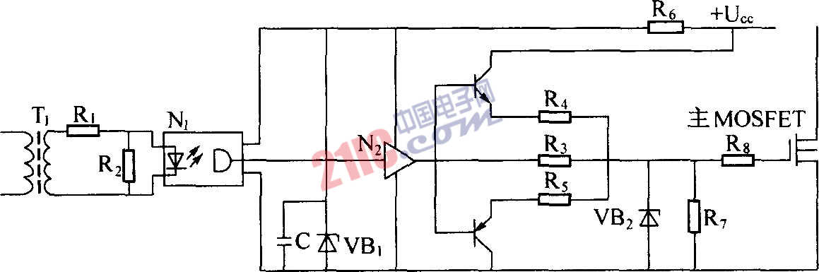 驅(qū)動電路的主要功能是將脈寬控制器輸出的可變寬度脈沖進(jìn)行功率放大,以作為高壓功率開關(guān)器件的驅(qū)動信號。驅(qū)動電路一般都具有隔離作用,常用變壓器耦合方式來實現(xiàn)對高壓功率開關(guān)器件的激勵和輸入級與輸出級之間的隔離,同時還兼有對功率開關(guān)器件關(guān)斷時,施加反向偏置,來加速器件的關(guān)斷。當(dāng)驅(qū)動MOSFET器件時,常規(guī)的驅(qū)動電路是用一個驅(qū)動變壓器實現(xiàn)的??紤]到驅(qū)動變壓器的漏感和引線電感,給具有大Cg-s的主MOSFET高速充放電造成困難,因此,通常的方式是利用驅(qū)動變壓器驅(qū)動一個具有較小Cg-S的MOSFET的圖騰式驅(qū)動電路,再由這個電路驅(qū)動主MOSFET。如圖,驅(qū)動變壓器的初級線圈輸入信號就是控制電路的輸出驅(qū)動信號,經(jīng)變壓器隔離處理后經(jīng)整形電路整形后輸出。變壓器起隔離作用,光耦既有隔離也有抗干擾功能,整形后經(jīng)圖騰式驅(qū)動電路驅(qū)動主MOSFET管。