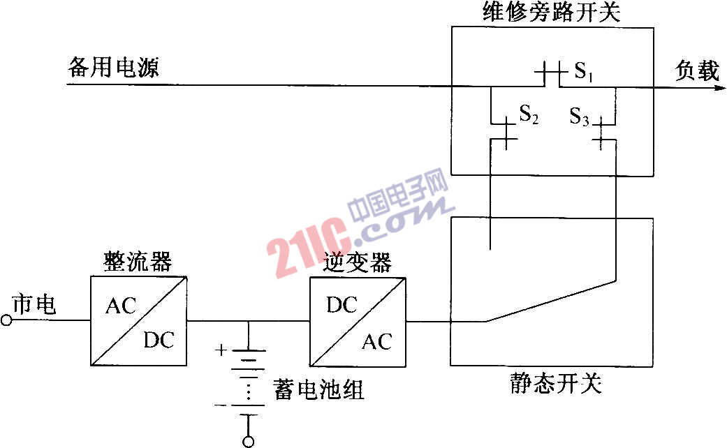 UPS電源依據(jù)逆變器組合方式可分為轉(zhuǎn)換型和并機型,設(shè)置靜態(tài)開關(guān)的單相轉(zhuǎn)換型UPS電源主電路框圖如圖所示。由圖可知,當(dāng)市電正常時,以逆變器輸出作為主用電源供給負(fù)載。為了便于維修,設(shè)置了一個手動維修旁路開關(guān),即檢修時先讓旁路開關(guān)S,閉合,然后使S2、S3和靜態(tài)開關(guān)斷開。改由備用電源向負(fù)載供電,則UPS系統(tǒng)與旁路系統(tǒng)脫離,此時便可對逆變器、靜態(tài)開關(guān)做維修。當(dāng)逆變器作主用電源時,先合上靜態(tài)開關(guān)和旁路開關(guān)S2、S3,再斷開S1。
