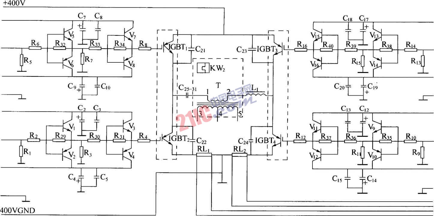 高頻變換器采用全橋型結構,4個臂上的IGBT分別由4個相互隔離的驅動器驅動,它們的工作電源為300V,在驅動脈沖作用下,兩個對角上的高頻開關管輪流同時導通,或同時截止,從而在主變壓器的初、次級獲得高頻脈沖電壓,以實現(xiàn)DC/AC的高頻變換。 在1#、4#驅動脈沖同時為正電位時,IGBT1、IGBT4同時導通,此時的IGBT2、IGBT3的驅動脈沖同為負電位,可靠截止,主變壓器T的初級將有電流流過,電流方向為從l端流向2端,初級感應電壓設為正脈沖,其幅度約為300V。 在2#、3#驅動脈沖同時為正電位時,IGBT2、IGBT3同時導通,此時的IGBT1、IGBT4的驅動脈沖同時為負電位,可靠截止,主變壓器T的初級將有反向電流流過,即從2端流向1端,初級感應電壓為負脈沖其幅度約為300V。這樣,隨著驅動脈沖的變化就在主變壓器T的初級(相應的也在T的次級)產生正負交變的脈沖電壓,流過正負交變的高頻脈沖電流,如圖下所示。