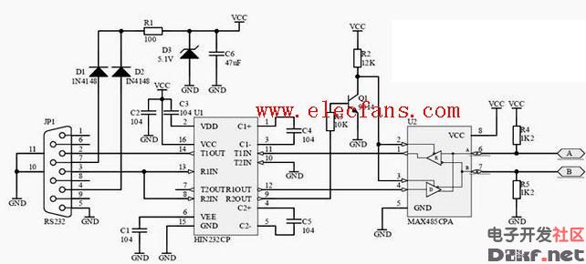 上圖就是市面上大量的一般無源的232轉(zhuǎn)485頭子的電路,你可以看到,在發(fā)送低電平時(shí),MAX485是工作的,但在發(fā)送高電平時(shí),MAX485的3腳為低,MAX485是不工作的,只靠線上的電位只由上/下拉電阻R4、R5來保證信號1的發(fā)送,要注意的是,R4、r5電壓也只是VCC(5v?)這是不合符485標(biāo)準(zhǔn)的,只能說短距離、少節(jié)點(diǎn)是還能湊合著用。而且這兩個(gè)電阻還對信號的傳輸帶來信號匹配上的影響。